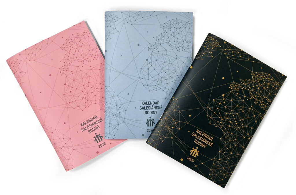 Kalendář salesiánské rodiny ve třech barvách: černé, starorůžové a modrošedé se stylizovanou mapou světa symbolicky propojující národy.