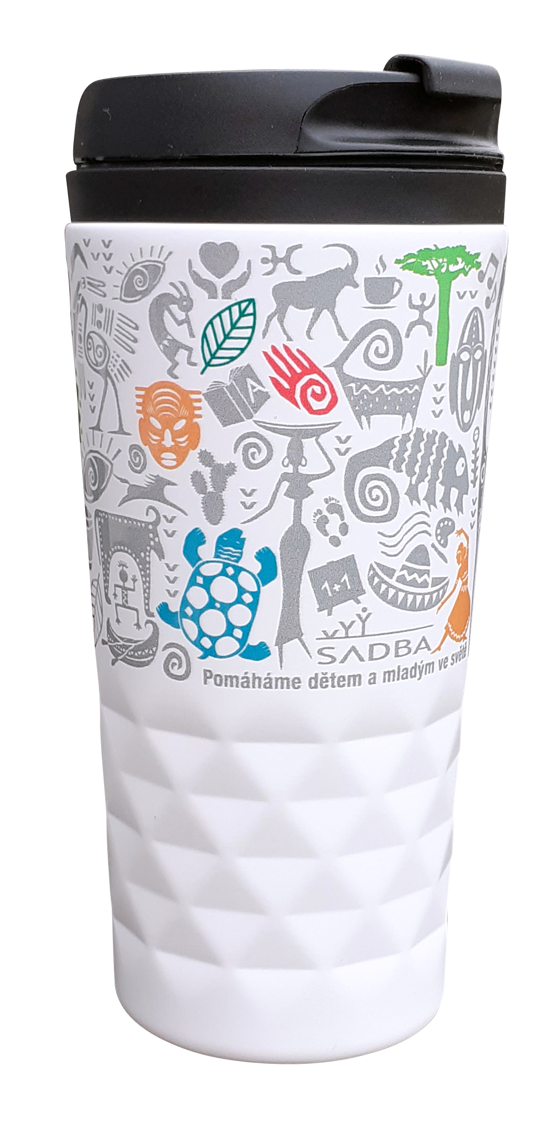 Nerezový elegantní termohrnek s objemem 300 ml, bílá barva a s geometrickou texturou ve spodní části a exotickými motivy.